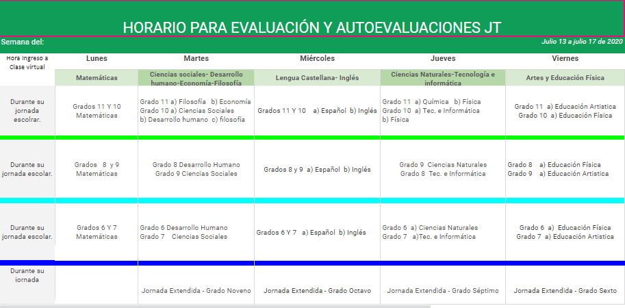 Durante esta semana estaremos realizando las evaluaciones del final del primer semestre, es decir del segundo corte. ( recuerda que este semestre se alargó por la situación de contingencia de salud). Te adjunto el horario de evaluaciones de esta semana: