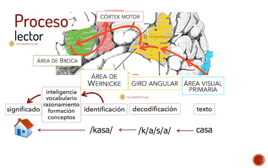 Los procesos NEUROLÓGICOS del cerebro suceden en forma natural, de esa misma forma debemos propiciar la lectura. Iniciamos con el proceso de IMAGINAR lo que leemos, dibujamos en la mente a manera de una foto o una película lo que dice la lectura (ÁREA VISUAL PRIMARIA). Luego DECODIFICAMOS la lectura, buscamos palabras que desconocemos, indagamos en palabras, personajes, elementos, etc (GIRO ANGULAR). Seguimos con el proceso de IDENTIFICACIÓN por asociación con nuestros recuerdos en la memoria, IDENTIFICAMOS LA IDEA PRINCIPAL para concentrarnos en el tema de la lectura (ÁREA DE WERNICKE). Comenzamos el proceso de COMPRENSIÓN de la lectura, INTERPRETAMOS, ARGUMENTAMOS Y PROPONEMOS, Aplicamos nuestra inteligencia, vocabulario, razonamiento para formar un concepto (ÁREA DE BROCA). Por último construimos un SIGNIFICADO, una REPRESENTACIÓN de lo que leemos (CORTEX MOTOR). Este proceso se realiza párrafo a párrafo de nuestra lectura.