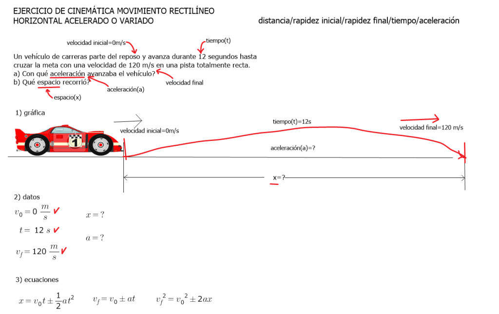 Esta es la condición real de la mayoría de los movimientos que se caracterizan por atrasarse o adelantarse en la unidad de tiempo, los medios de transporte y todo objeto que posee una masa se ve afectado por su peso, por la fricción y otros factores que no permiten un movimiento constante, ni perfecto. El cuerpo experimenta variaciones iguales en su velocidad durante tiempos iguales. Este movimiento también es llamado MOVIMIENTO UNIFORMEMENTE ACELERADO (M.U.A.) Las relaciones que regulan dicho movimiento son:De acuerdo con el problema y los datos que se tienen se selecciona la ecuación a emplear, como se ve en el ejemplo 2: