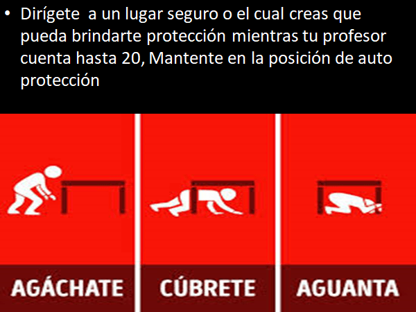- Practica con tu familia la posición de AUTOPROTECCIÓN (Cúbrete la cabeza con ambas manos, agáchate y ubícate en posición de cuclillas e inclina la cabeza junto a las rodillas)