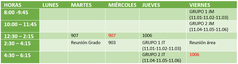 Horario de trabajo Semanal de Clases. Las clases en color Rojo son asincrónicas. Los enlaces a las clases se encuentran en CLASSROOM