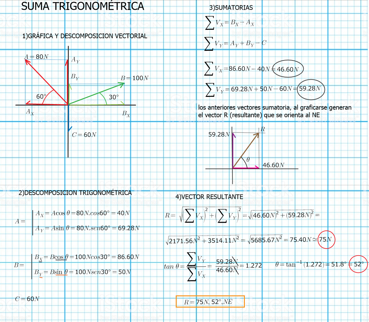 Continuamos desarrollando ejercicios de SUMA DE VECTORES MÉTODO TRIGONOMÉTRICO: