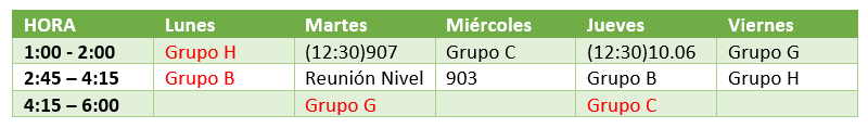 Horario de trabajo Semanal de Clases. Las clases en color Rojo son asincrónicas. Los enlaces a las clases se encuentran en CLASSROOM