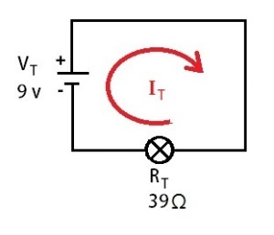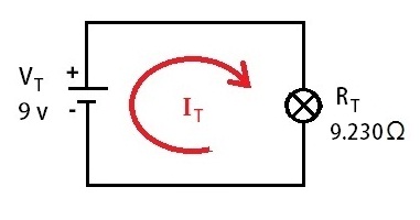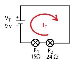 Vamos a darle unos valores a las Resistencias (Bombillas en este caso) y a la Fuente de Voltaje (Pila), CERREMOS el Circuito y observemos que la Corriente Total del circuito (IT) no se desvía hacia ningún lado; Sale del polo Positivo de la Pila atravesando el interruptor, circulando por el hilo conductor, llegando inicialmente a la Bombilla de 24 Ohmios la cual consume parte del voltaje que envía la Pila para poder encenderse y luego continua hacia la otra bombilla de 15 Ohmios, la enciende y retorna a la pila.