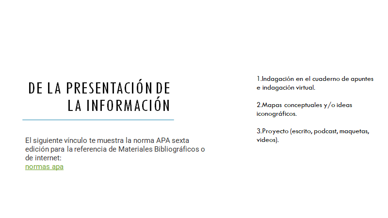 Emplearemos tres formas de presentación de la información ( indagación en nuestro cuaderno de apuntes, Mapas conceptuales y de ideas, Proyectos escritos) y debemos conocer todo respecto a ellas. Así generamos herramientas de trabajo adecuadas al desarrollo de habilidades en pensamiento crítico, científico, creativo e innovador.