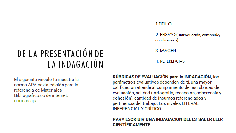 Con dichas IDEAS PRINCIPALES va a su casa y en internet y libros consulta para construir un texto de indagación que cumple unos mínimos (TÍTULO, ENSAYO, IMAGEN Y REFERENCIAS) lo cual irá ubicando al estudiante en el contexto de la ESCRITURA CIENTÍFICA.