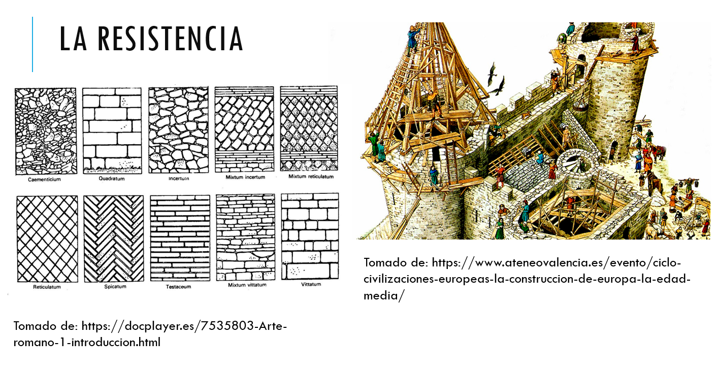 Aunque para esta época no hay estudios de resistencia de materiales, LA RESISTENCIA de las construcciones medievales depende de los métodos de construcción y forma de apilar los materiales en las paredes, donde la mayoría de las columnas y vigas estaban elaboradas en madera. Esto siguiendo el método ROMANO o GRIEGO de construcción.
