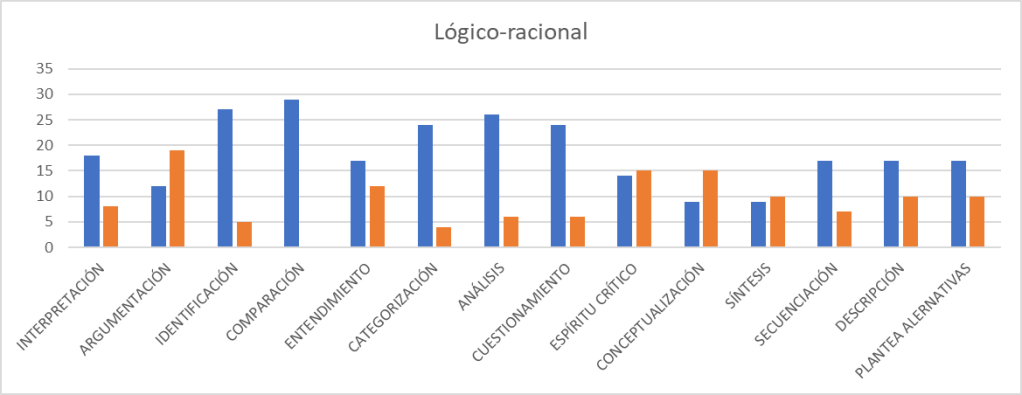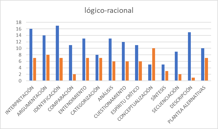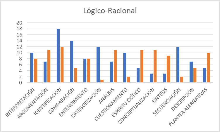 En el aspecto Lógico-racional se destacan las habilidades de IDENTIFICACIÓN de conceptos, COMPARACIÓN, CATEGORIZACIÓN Y SECUENCIACIÓN de procesos. Desean desarrollar habilidades de CONCEPTUALIZACIÓN, ESPÍRITU CRÍTICO, ANÁLISIS y ARGUMENTACIÓN prioritariamente.