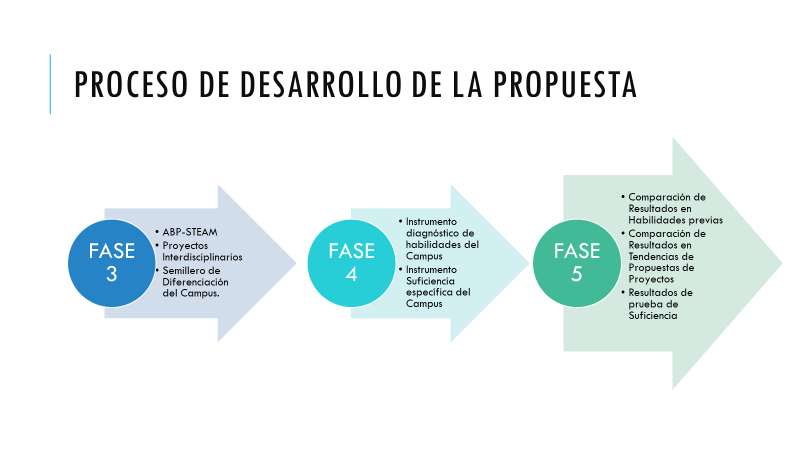 FASE TRES: en esta fase se implementan luego de consenso y trabajo colaborativo entre los docentes y comunidad académica enfoques desde el aprendizaje ACTIVO, como son ABP (aprendizaje basado en proyectos) y STEAM (Science, Technology, Engeeniering, Arts and Mathematics). Surge de esta última propuesta un Semillero de Formación Específica de nuestro campus con estudiantes que voluntariamente desean profundizar en el campus.