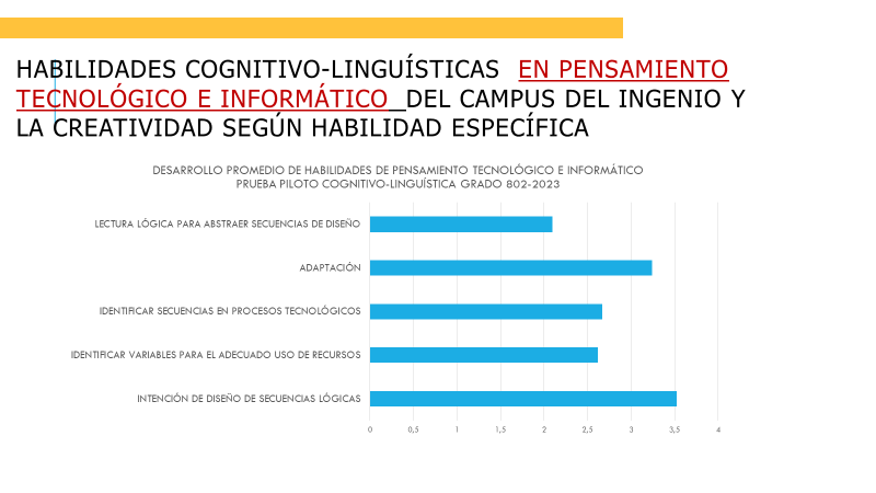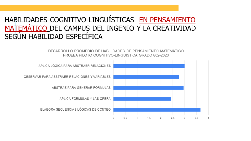 Las anteriores pruebas están basadas en un máximo puntaje de 4 sobre el cual se calificaron los estudiantes del grado 802 indicándonos la insuficiencia en muchos de los aspectos específicos del campus ( HABILIDADES COGNITIVO- LINGÜÍSTICAS). Se deben replantear los métodos de selección de los estudiantes y dar prioridad a las habilidades específicas del área sin dejar de lado las habilidades VOCACIONALES o MOTIVACIONALES de los estudiantes.
