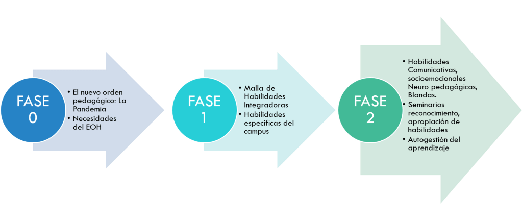 FASE UNO: Una vez implementado el MULTICAMPUS y la orientación de los chicos a sus diferentes enfoques el colegio se da cuenta que la estructura del multicampus tiene falencias en la ubicación de los estudiantes en los diversos espacios, en la creación de instrumentos que permitan la visibilización de las necesidades de los estudiantes, en como involucrar en la propuesta a toda la comunidad educativa y es así como surge una fase de ESTRUCTURACIÓN; donde el CURRÍCULO de cada uno de los CAMPUS reconoce en las HABILIDADES un fuerte de trabajo INTERDISCIPLINAR que le permitirá tejer la estructura de cada uno de estos campus.