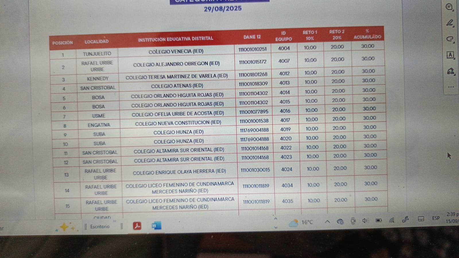 Luego de presentar nuestros trabajos pedagógicos en los RETOS OLIMPICOS STEM estamos clasificados en el lugar 13 de 176 colegios participantes: