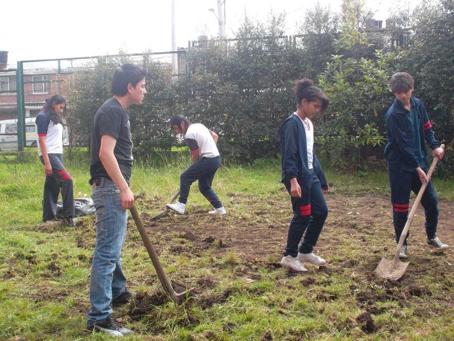 Los jóvenes de bachillerato preparan el terreno para que los niños de primaria siembren y cuiden el cultivo.